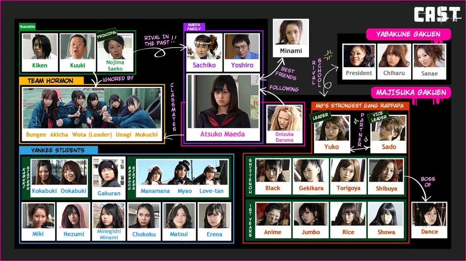 Two transfer students, Atsuko Maeda and Onizuka Daruma, came to the all-girls school Majisuka Gakuen. In this school, violence and fighting were commonplace among the delinquent students. The troublemaker Daruma made a fuss as soon as she entered the school. She won her first fight, but was easily beaten by another gang shortly afterwards. In contrast to the other transfer student, Atsuko was actually much stronger than her unobtrusive behavior suggested. When Atsuko encountered Daruma being beaten up by Team Hormone, the gang mocked Daruma's use of the word "maji" (serious). Overhearing this was enough to awake Atsuko's true nature, and provoke her into a fight against Team Hormone. When she won this battle easily, the news of her victory even reached the strongest fighting group, Rappapa. Afterwards, Daruma became the self-proclaimed underling of Atsuko. The friendship between the two transfer students eventually began to grow as Atsuko was challenged by students of increasing strength.