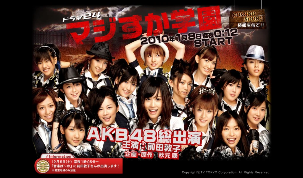 Majisuka Gakuen (マジすか学園) was a drama that featured members of AKB48, SKE48, and SDN48 as its main cast. It is the first season of the Majisuka Gakuen Series. It aired Fridays at 24:12 on TV Tokyo from January 8, 2010 to March 26, 2010. The average viewership rating was 3.67% over 12 episodes. A second season, Majisuka Gakuen 2 (マジすか学園2), was aired in 2011.